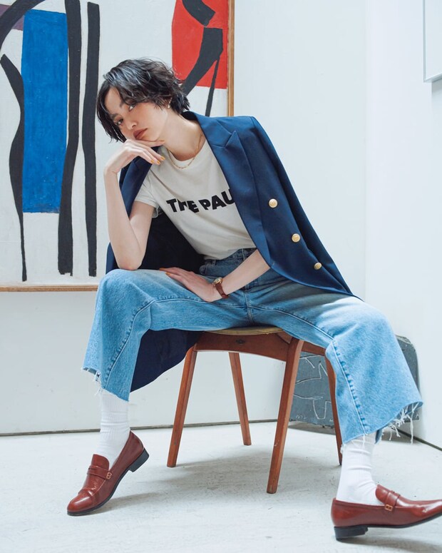 ロゴT×デニムのカジュアルスタイルも、紺ブレを羽織るだけで一気にきちんと感UP。さらにレザーのローファーと腕時計をプラスすることでトラッド感溢れる着こなしに。ゴールドジュエリーで女性らしさも忘れずに。