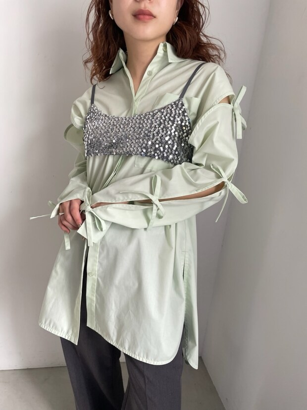 「春らしい爽やかなミントカラーのシャツをメインに、コーディネートを組みました。袖のリボンディテールがフェミニンな印象のシャツを、メンズのトランクスパンツとレイヤードしたパンツと組み合わせて、好きなカジュアルフェミニンのテイストに仕上げています。メタリックなビスチェを重ねて自分らしさをプラス」