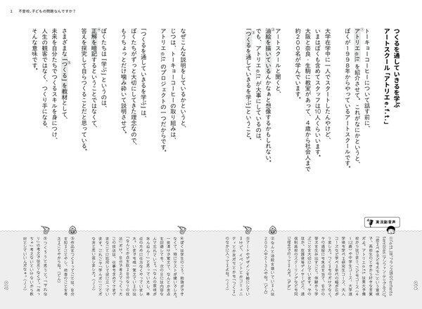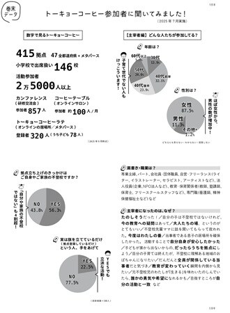 さらに、刊行にあわせて参加者アンケートを行い、トーキョーコーヒーの活動や不登校の実態をデータで紹介するページも作成。子どもたちや保護者のリアルな声を伝えている。