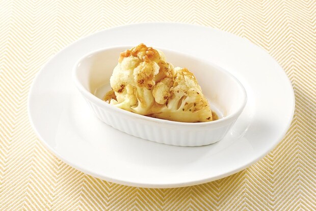 旬の国産カリフラワーをオーブンで焼き上げた。ガーリックとレモンが香る醤油バターソースで味付けしている。