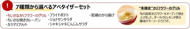 なお、「選べるアペタイザーセット」は、以下の7品から1品選べる。