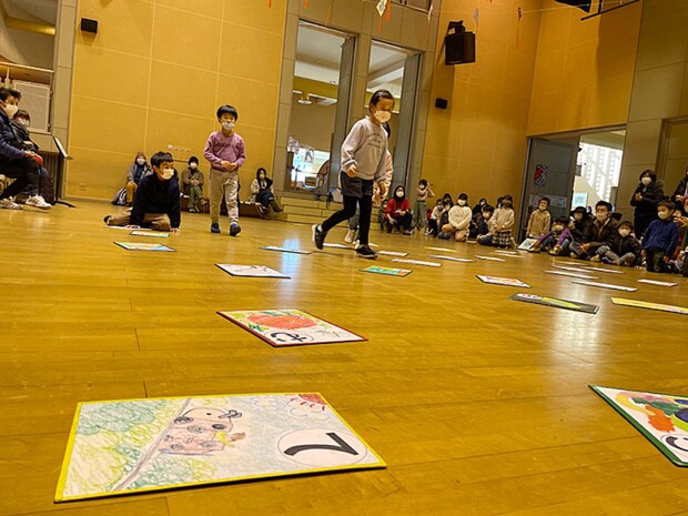 会場全体が伝統的なお正月装飾で彩られ、明るく楽しい雰囲気が広がっています。