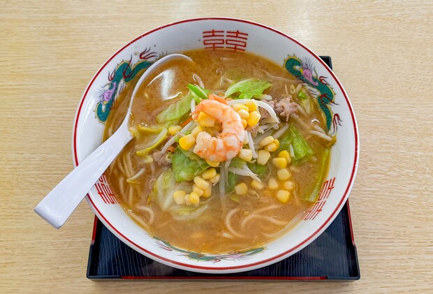 この筑豊一細い建物で味わえるのがたっぷりのコーンや野菜の上に海老がのった彩り豊かな「みそチャンポン」。