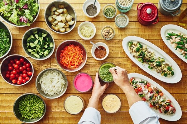 その4「身体喜ぶ 15品目の新鮮野菜のサラダブッフェ」は美肌、身体の調子を整える、疲労回復などテーマごとに選べる。ホテル自家製オリジナルドレッシング4種類、ホテルシェフによるデリ3種も用意される。
