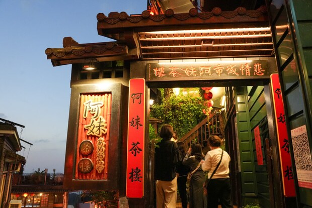 夕暮れ時に赤い提灯が灯る幻想的な雰囲気の茶藝館「阿妹茶樓(アーメイチャロウ)」。