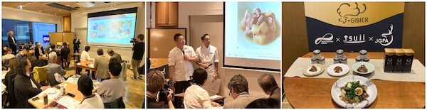 12月1日(月)の試食会では、日本ジビエ振興協会代表理事の藤木徳彦氏による“ジビエを取り巻く社会課題について”のプレゼンテーションと、東洋製罐グループイノベーション推進室長の三木逸平氏のプロジェクトの紹介が行われた。続いて「長野のジビエ缶三種」のレシピを考案した辻󠄀調理師専門学校東京の西洋料理教員・秋元真一郎氏と日本料理教員・野中覚氏が登壇し、このプロジェクトに取り組む意義や開発エピソードについて紹介。参加者に「長野のジビエ缶三種」とジビエ缶を使ったアレンジメニューの試食を提供した。