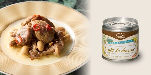 「Confit de chevreuil~柑橘香る鹿肉と大豆のコンフィ~」は、柑橘の爽やかな香りと山椒のスパイス感、大豆の食感が奥行きを添え、オイルと鹿肉が引き立て合う贅沢な一缶だ。長野県産の鹿肉を米油とともにコンフィに仕立て、「山のお肉」ジビエに「畑のお肉」大豆を合わせた。たんぱく質をはじめ栄養にも優れた一品で、そのままワインのお供としてはもちろん、好みの調味料でアレンジしたり、パスタソースに仕立てたり、料理の幅を豊かに広げてくれる。