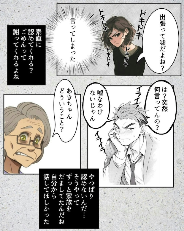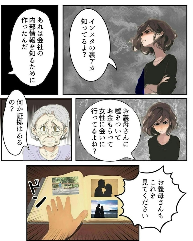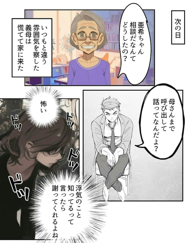 ついに、探偵の調査のおかげで、不倫の決定的な証拠をつかむことに成功したのです。亜希は義母を自宅に呼び、夫を問いただします。