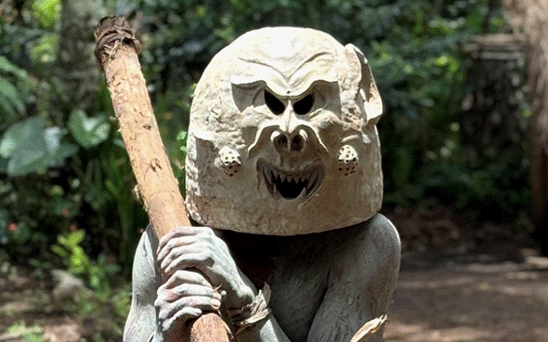息をひそめながら敵が通り過ぎるのを待とうとしたが、敵が泥沼のそばにやって来た瞬間、「今なら意表を突くことができる!」と泥の中に隠れていた村人たちは一斉に姿を現した。全身が灰色の泥に覆われ、その顔はまるで泥が固まってできた仮面のよう。目の部分だけが黒くくぼみ、口元は無表情に固まっている。その異様な姿を見た敵は、「精霊だ」「不吉な存在だ」「泥のお化けだ!」と恐れて逃げ出し、村人たちは戦いに勝利した。