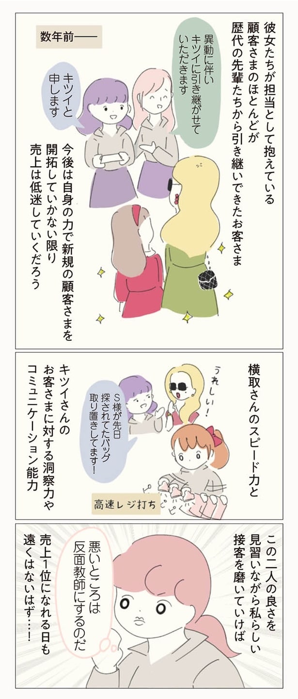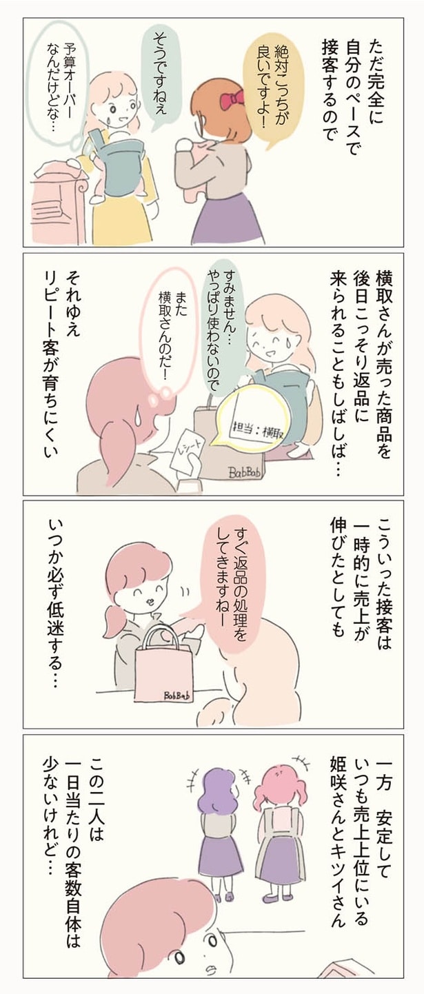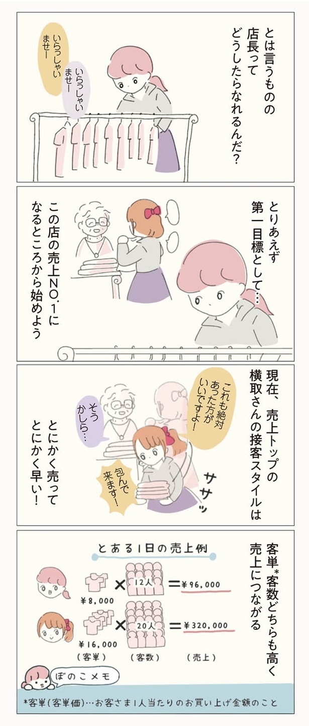 子ども服ブランドでショップ店員をしているぼのこは、数ある店舗の中でも花形のB店へ異動が決まった。B店は花形と言われる一方で、昔からの派閥争いが有名。新人や異動してきたスタッフがすぐに退職してしまうという疑惑があるのだった。緊張の中、異動初日を迎えたぼのこは、早速、店長やスタッフたちから理不尽な思いを受ける。ねちねちマウンティングや悪口に陰口、過剰な先輩優先システムなど…。やがて心身ともに疲弊したぼのこは、この店舗に誰一人味方がいないことを確信。お店の悪しき風習を断ち、スタッフたちに「復讐」するため、ぼのこは店長を目指すことを決意するのだった――。