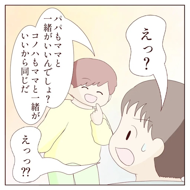 クルミにそう言われて「えっ?」と驚くマサヒコ。すると、「パパもママと一緒がいいんでしょ?コノハもママと一緒がいいから同じだ」とコノハに言われ、「えっっ??」とマサヒコの動揺は止まりません。
