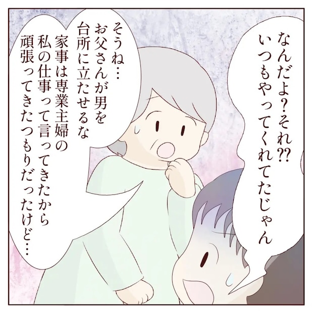 義母の言葉に大慌てのマサヒコは、「なんだよ?それ??いつもやってくれてたじゃん」真っ青な顔でそう言うと、「そうね・・お父さんが男は台所に立たせるな。家事は専業主婦の私の仕事って言ってきたから頑張ってきたつもりだったけど・・」と、どうあがいてもマサヒコが義実家にいることは受け入れられないようでした。