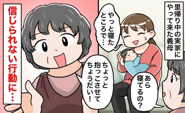 里帰りした投稿者さんの元に夫と義母がやってきて…。やっと眠れそうな赤ちゃんを無理やり起こそうとしたそう。投稿者さんが言うように、起きてるところを見たい気持ちはわかりますが、寝ている状態の赤ちゃんを愛でてほしいものですね。