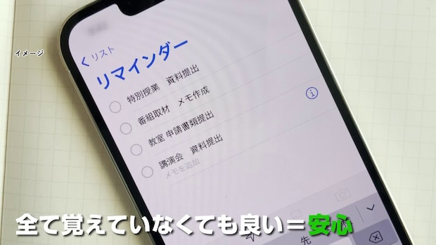 仕事の連絡や課題が出たら、すぐにスマホなどのリマインダーに登録! 「全てを覚えていなくても大丈夫、通知が来るから」という安心感が負担を減らし、目の前の作業に集中させてくれます。