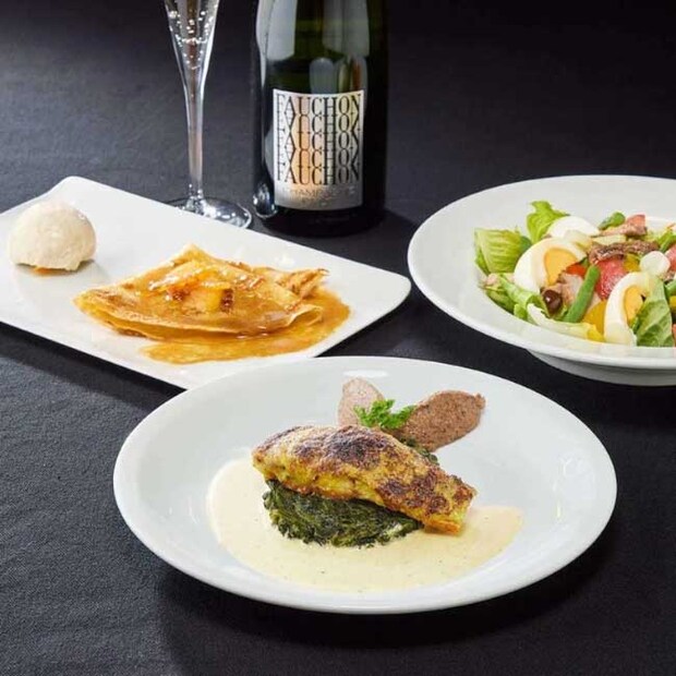 秋の味覚が満載のプリフィックスディナーでは、ニース風サラダやヴィシソワーズなどの前菜に加え、鯛の香草バター焼きや合鴨のコンフィなど季節感あふれる主菜をセレクト。彩り美しく、味わいも本格派。