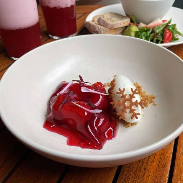 今回は、まったり濃厚なクラムチャウダーと、さっぱりとした苺×ビーツのサラダが登場しました。特にいちごとビーツの組み合わせは、甘みと酸味、野菜らしい香りのバランスがよく、スイーツの合間のちょうどいいリフレッシュになります。