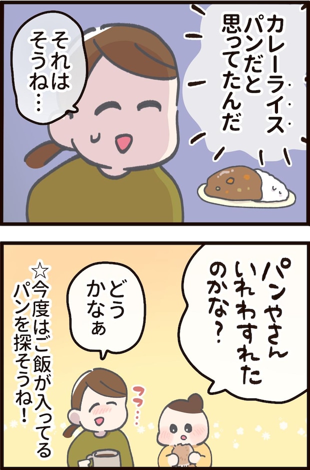 2025年12月12日 パン屋さん、ご飯入れ忘れたのかな? 5さいのかわいい勘違い/たきもとキウイの あ!いい天気~! ASOPPA! 娘がパン屋さんデビューしました! 登場人物紹介 パン屋さんで買ったパン、何かがおかしい……? まとめ 初めてのカレーパン、娘は「ご飯が入ってない!」とびっくり。 そうだよね、食べたことなかったらそう思うよね。 家のカレーはご飯にかけて出てくるもんね……。 そんな視点にフフっと笑っちゃいました。 漫画・文/たきもとキウイ