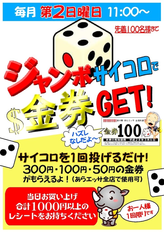 毎月開催のジャンボサイコロで金券ゲットは11時からの開催。