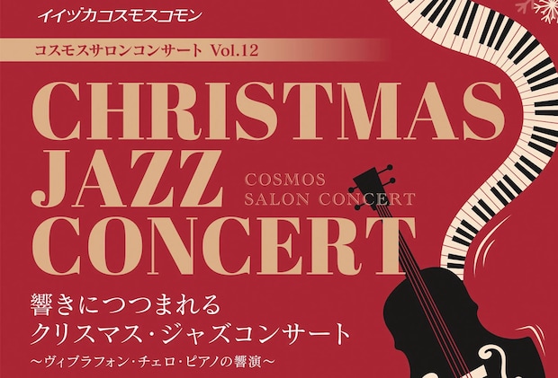 12月14日(日)、イイヅカコスモスコモンでコスモスサロンコンサート Vol.12「響きにつつまれるクリスマス・ジャズコンサート ~ヴィブラフォン・チェロ・ピアノの響演~」が開催されます。