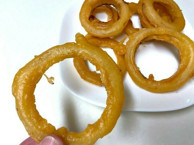 素を水で混ぜて、輪切りの玉ねぎに衣をつけて揚げるだけ。