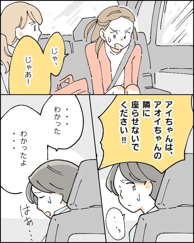「じゃ、じゃあ!アイちゃんは、アオイちゃんの隣に座らせないでください!!」と自分が降りた後のことまで指示するヨウちゃん。自分のいないところでアイとアオイちゃんが仲良くするのが嫌なのでしょう。私はうんざりしながら「・・わかった。わかったよ・・」と答え、なんとか納得したヨウちゃんを降ろしました。