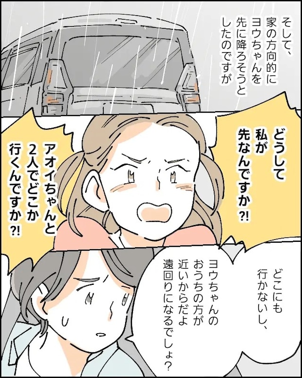 そして、家の方向的にヨウちゃんを先に送って行こうとしたのですが、自分が先に降りるとわかったヨウちゃんが「どうして私が先なんですか?!アオイちゃんと2人でどこか行くんですか?!」と怒り出しました。「どこにも行かないし、ヨウちゃんのおうちの方が近いからだよ。遠回りになるでしょ?」となだめると、