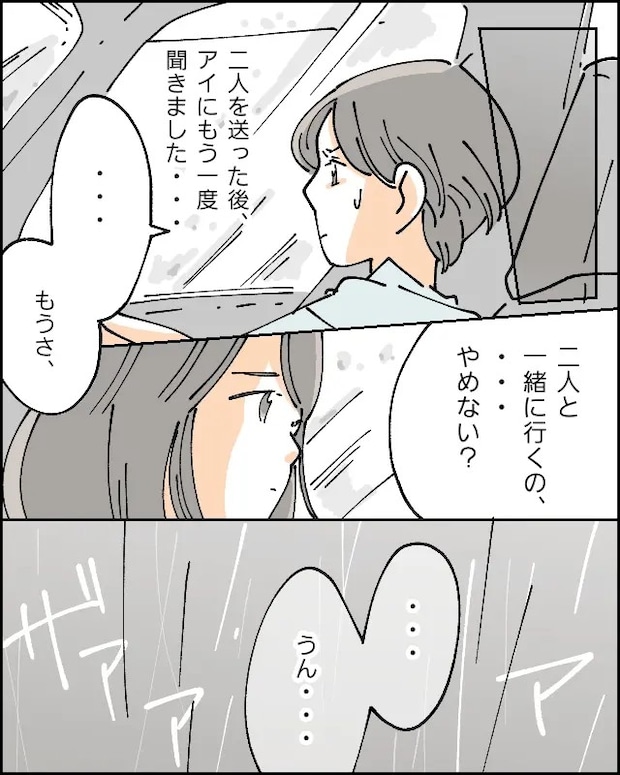 二人を送った後、私はアイにもう一度聞きました。「・・・もうさ、二人と一緒に行くの、やめない?」アイはしばらく考えて「・・・うん」と静かに言いました。