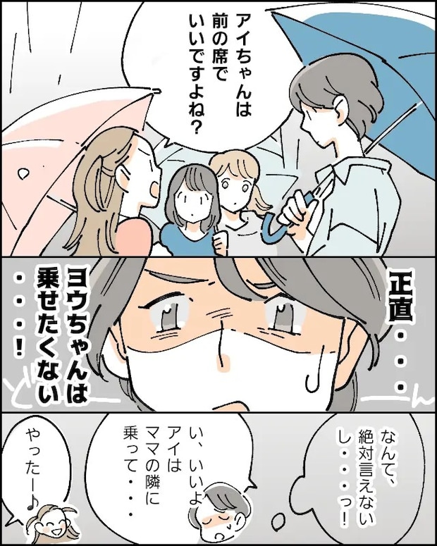 我が家の車なのに、「アイちゃんは前の席でいいですよね?」となぜか主導権を握るヨウちゃん。正直ヨウちゃんは乗せたくない・・!と心の中で思ったものの、そんなことを言えるはずもなく「い、いいよ。アイはママの隣に乗って・・」と私が折れ、自分の思い通りになったヨウちゃんは「やったー!」とご機嫌。