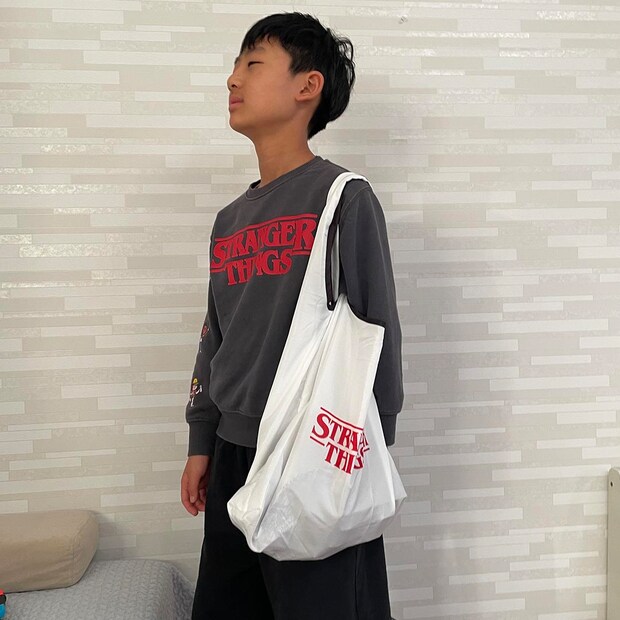 せっかくなので、ちょうどストシンスウェットを着ていた長男に持ってもらいましょう👦145cmが持つとこんな感じです😁