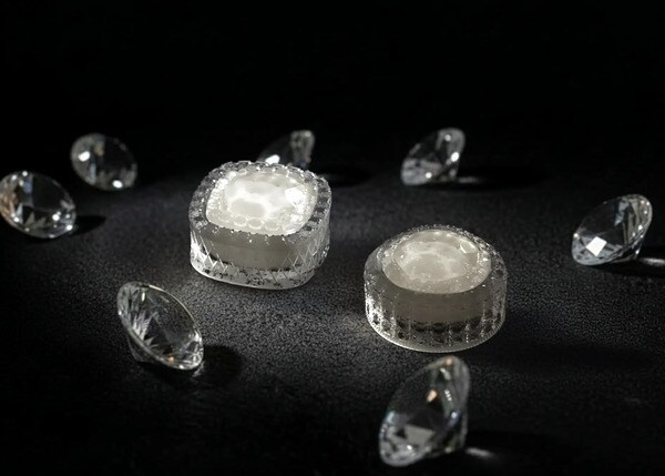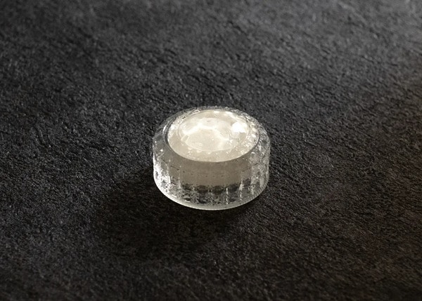 その緻密なデザインは3DCADを用いて設計され、宝石のブリリアントカットを模した120個のメレダイヤのようなカッティングが光を反射している。