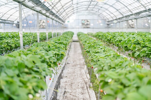 ハウス内では、愛媛生まれの「紅い雫」をはじめ、「あすか」や「おいCベリー」など、20品種が栽培されています。