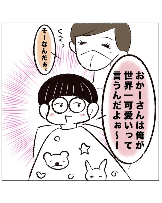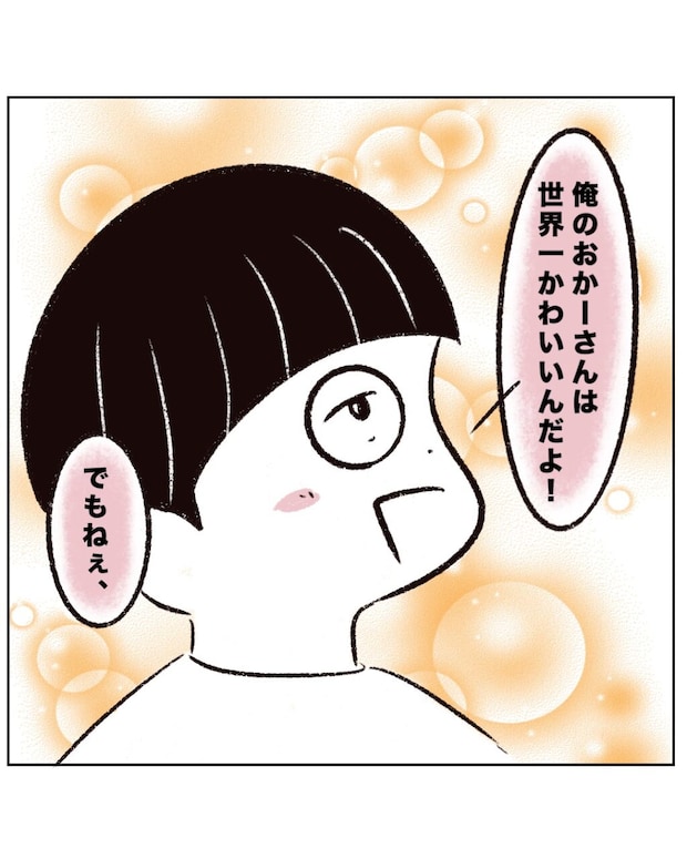 アキくんは、キラキラと目を輝かせながらこう言いました。「俺のおかーさんは世界一かわいいんだよ!でもねぇ・・・」
