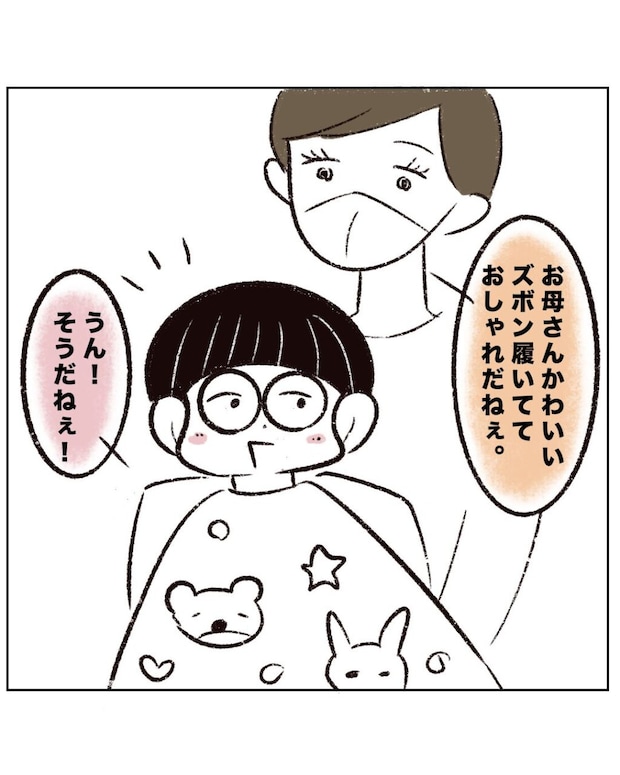 すると美容師さんが、「お母さん、かわいいズボン履いてておしゃれだねぇ」とアキくんに声をかけます。アキくんは嬉しそうに「うん!そうだねぇ!」と返事をしました。