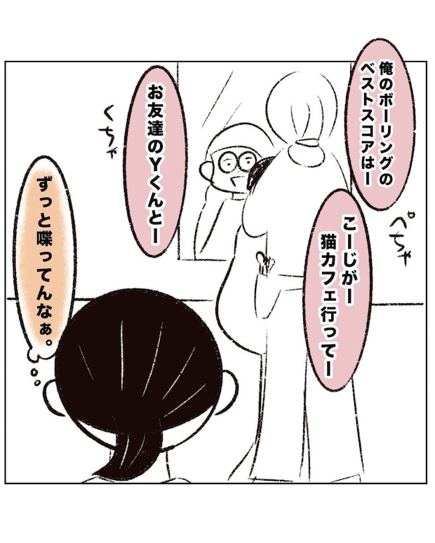 「俺のボーリングのベストスコアは~」「こーじが猫カフェ行って~」「お友達のYくんと~」休むことなくおしゃべりを続けるアキくん。その背中を、まるさんは「ずっと喋ってんなぁ」と静かに見守っていました。