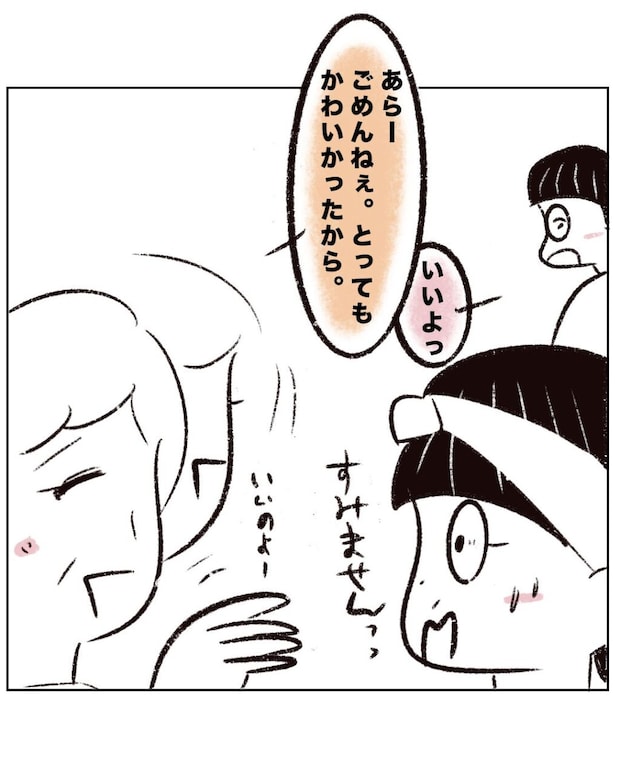 お客さんは状況がつかめないまま、「ごめんねぇ、とってもかわいかったから」と優しく謝罪。するとアキくんは「いいよっ」とあっさり許します。まるさんは褒めてくれたお客さんに、すみませんとお詫びを伝えました。