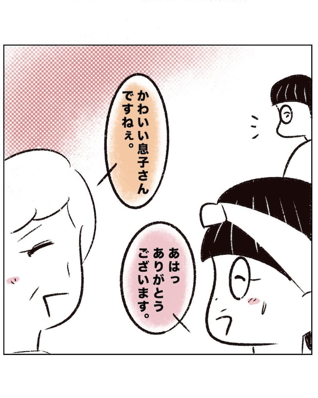 アキくんと美容師さんのやり取りを見ていた別のお客さんが、「かわいい息子さんですねぇ」とまるさんに声をかけてくれました。まるさんは、嬉しいような恥ずかしいような気持ちで、「ありがとうございます」と微笑みます。