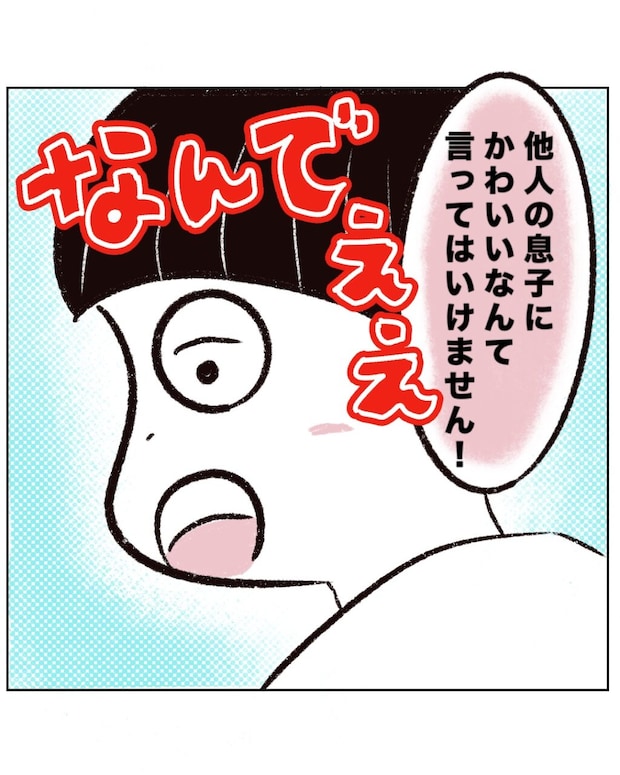 すると会話をちゃっかり聞いていたのか、アキくんは後ろを振り返ると「他人の息子にかわいいなんて言ってはいけません!」と言いました。その言葉を聞いたまるさんは、心の中で「なんでぇぇ!」と叫びます。