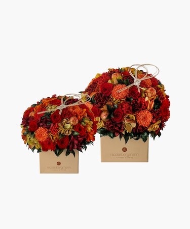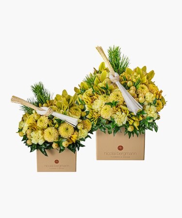 フレッシュフラワーの「New Year Cube – Akane」と「New Year Cube – Kogane」は、水引とあたたかみのあるマムやカーネーション等の花材を合わせた華やかなアレンジで、丸く美しいラウンドスタイルにポイントとなる松がお正月らしさを際立たせている。飾る場所を鮮やかに彩り、新しい一年を迎えるひとときを華やかに演出する。