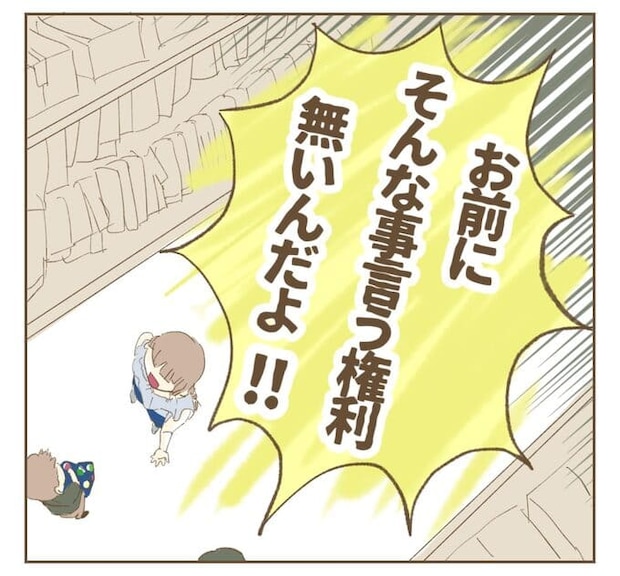 ある日「アキラくんとおそろいで甚平を着たい」という息子の言葉を聞き、イオリさんはアイさんと子どもたちと一緒に甚平を買いに来ました。アイさんは映える甚平を見つけ、アキラくんに「これにしよう!」と提案します。しかし、アイさんの提案をアキラくんは拒否。「ママが言ってるやつはママが好きなんでしょ!?ぼくはイヤだ!!ダサいっ!!」と泣きながら訴えました。アキラくんの言葉を聞いたアイさんは「黙って聞いとけ!!」と怒鳴ります。