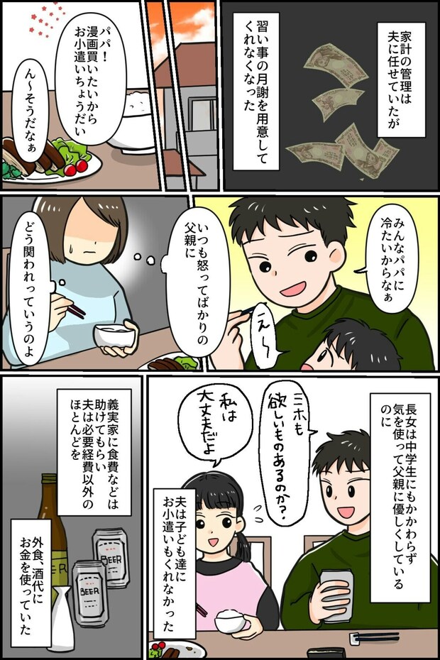 夫は子どもたちにお小遣いすらくれず、必要経費以外のお金はお酒や外食に使ってしまうようになり、主人公は義実家に助けてもらいながら自分の収入だけでやりくりしていました。しかし、夫には生活費を負担していないと責められることに…。