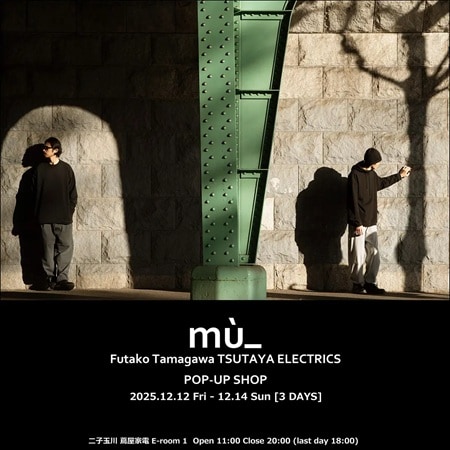 メンズファッションブランド「mù_(ムー)」は、12月12日(金)~14日(日)の3日間、二子玉川 蔦屋家電 E-room1にてPOP-UP SHOPを開催する。