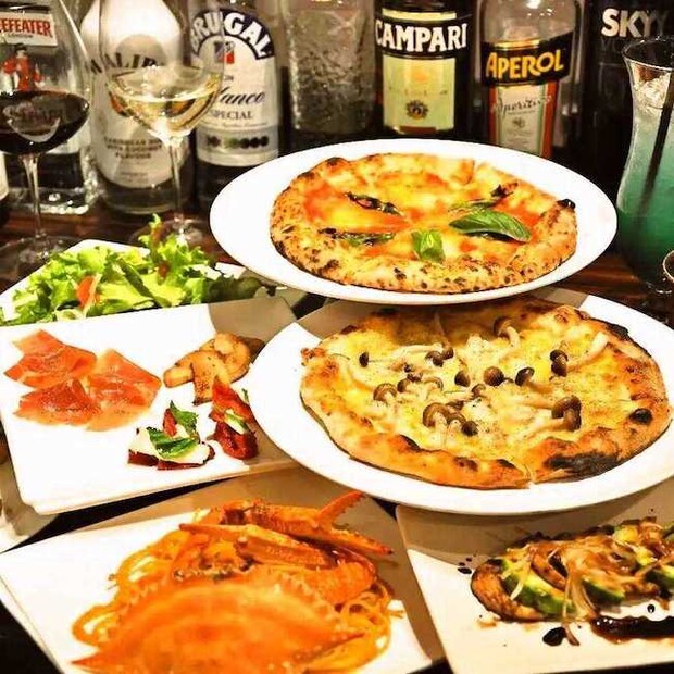 フレッシュトマトとしらすのブルスケッタ/自家製ドレッシングのグリーンサラダ/前菜3種盛り合わせ/窯焼きピザ(人数により最大7種類)/シェフおすすめのパスタ/季節のリゾット/デザートアイスクリーム