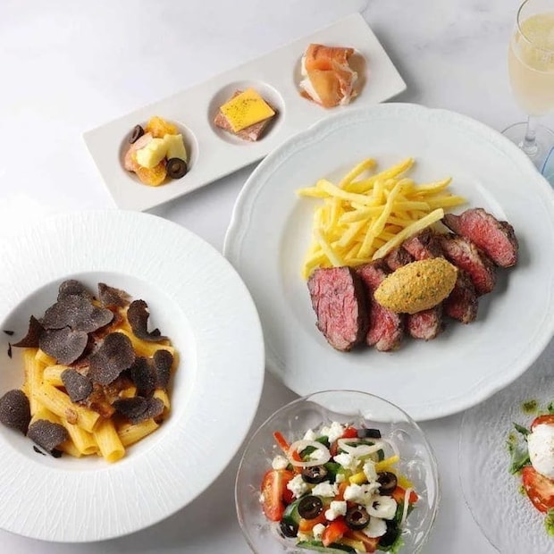 前菜3種の盛り合わせ/彩り野菜と豆のサラダ チェダー風味のスパイスドレッシング/チーズと季節のフルーツのカプレーゼ/チーズプラトー黒トリュフのペンネカルボナーラ/牛ハラミのステーキ~ハーブスパイスチーズソース~/アニバーサリーホールケーキ(メッセージ対応無料)/コーヒー、または紅茶
