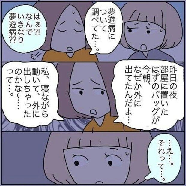 ある日、夢遊病について調べていた加藤かとさん。実はその前日、飲み会に参加し楽しい気分で帰ってきたのですが、朝起きるとカバンが家の外に出ていたのです。かとさんは自分の記憶違いか夢遊病を疑っていますが、友人は別の何かを心配している様子。