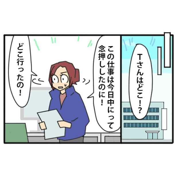 今日中に仕上げなければいけない、デスク作業に取り組まず、姿を消していたTさん。社員が探していると、ふらりと戻ってきます。そして、「現場の方に呼ばれていた」と言い訳をしますが…。