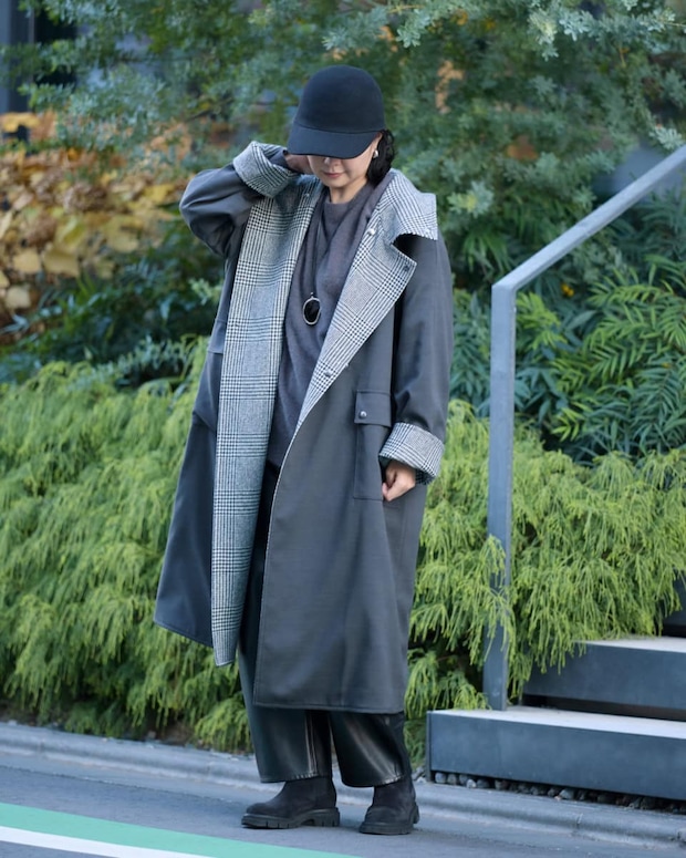「リバーシブルで着られるコートです!どちらを表にしても可愛く、その日の気温や気分によって着分けています。オーバーサイズのため、中に着こめば真冬の寒さもOK。上品な柄でキレイめなコーデやカジュアルスタイルにも合わせやすく、洒落見えする優秀コートです」コート¥85,800(リエス)