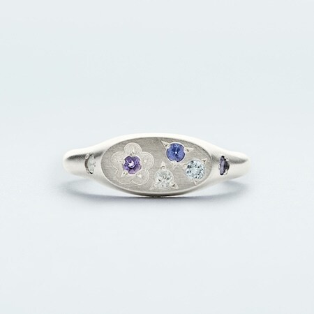 「Flower Signet Ring Mini」Silver925、Blue/¥39,000も用意されている。モードと詩情が交差するデザインは、日常のスタイリングに新しい自由をもたらす。