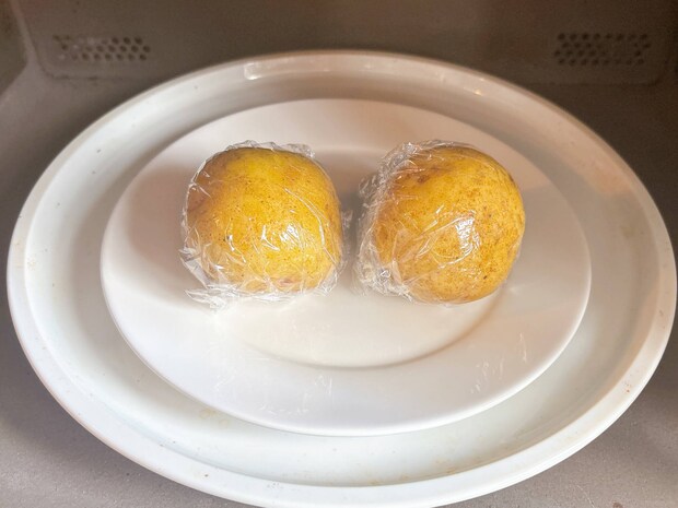 ホクホクにするためには、流水でじゃがいもをよく洗ってから包丁で芽をとり、水気をきらずにそのままラップで包みます。途中で上下を返すとムラなく加熱できますよ。加熱後そのまま2〜3分おいて蒸らすとしっとりホクホクに仕上がります。