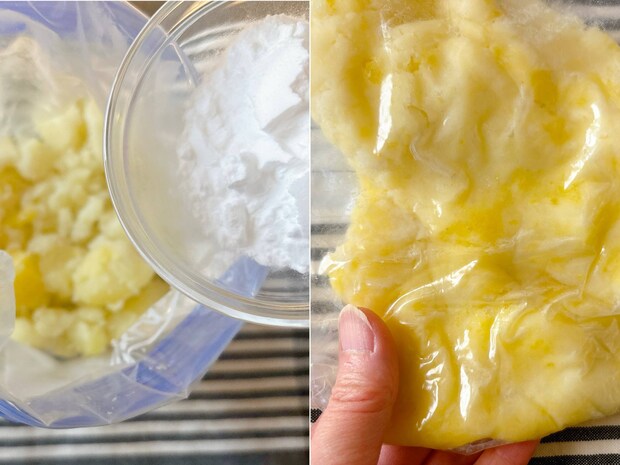 じゃがいもをレンジ加熱して潰し片栗粉を入れてこねる