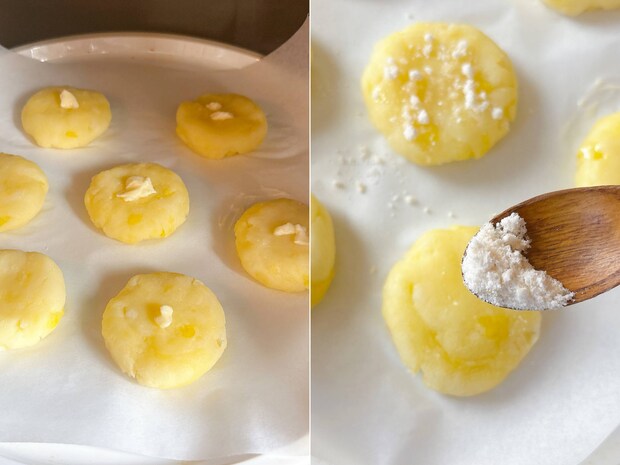 4等分し、平たく成形しクッキングシートに並べます。厚みは1cmほどがおすすめです。